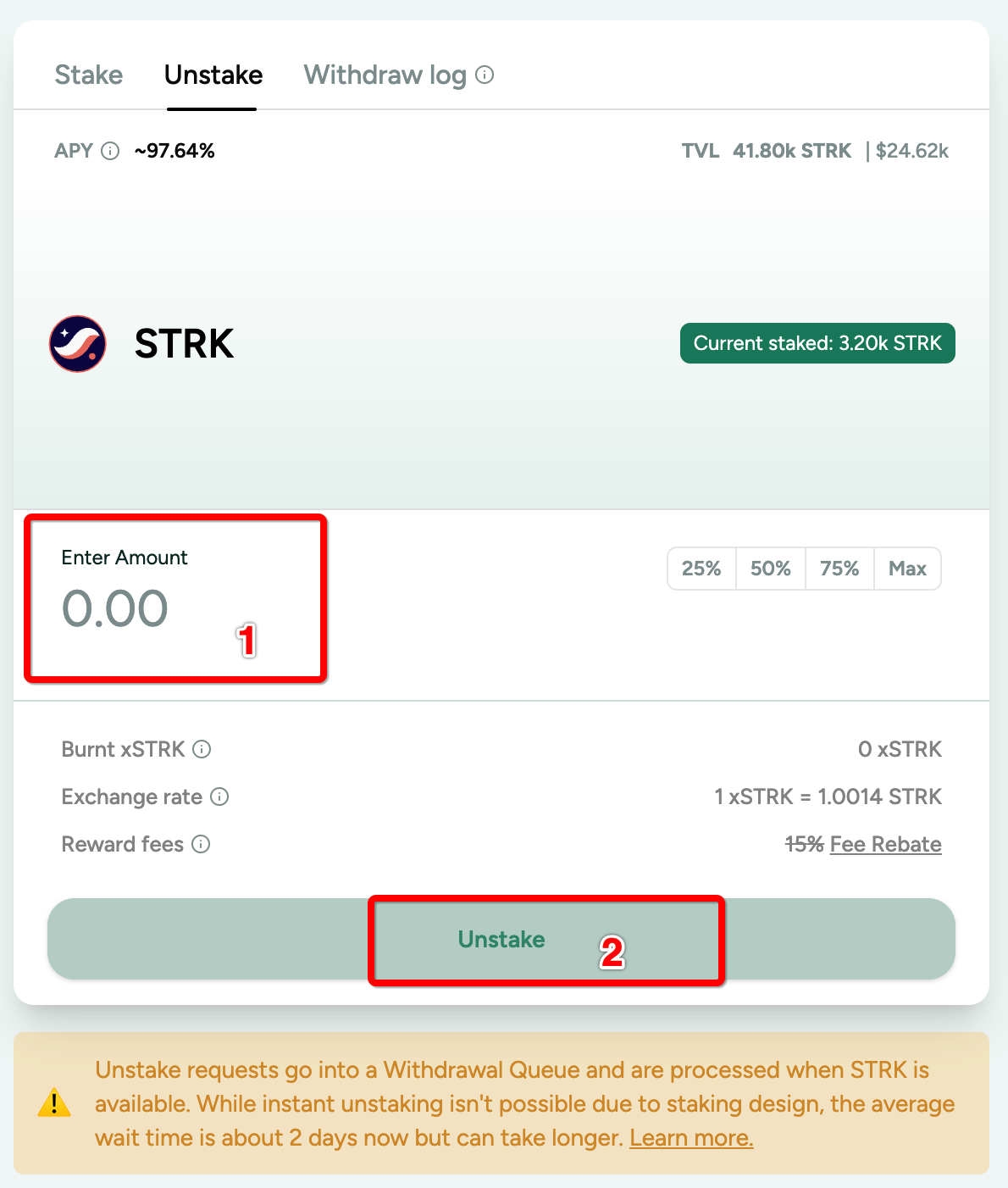Enter the amount of xSTRK you wish to unstake.